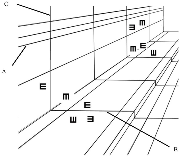 异构视力表,其为由异构参照区和尺寸大小不同的至少2种视标组成的大小错视图,异构参照区能够导致对不同种尺寸的视标大小的误判,视觉上认为某种较小视标不小于另一种较大视标。异构参照区为能够对大小不同视标产生视觉深度影响的透视图,将M个较大视标放在透视图中视觉上更近的位置,将N个较小种视标放置在透视图中视觉上更远的位置,M和N为≥1的正整数,通过造成对视觉深度的错觉,进而导致对不同种尺寸的视标大小的误判。异构参照区还包括能够使较小视标在视觉上更大,较大的视标在视觉上更小的错视图形,错视图形包括字母图形、数字图形、几何结构图形、锥形体中的一种或多种。