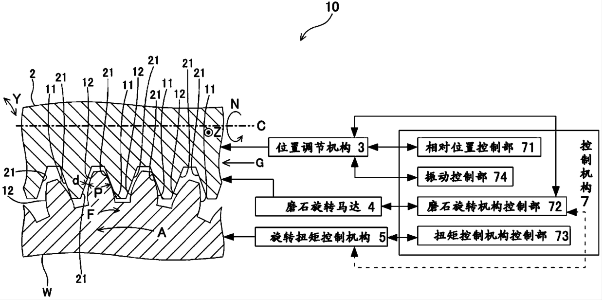 一种齿面加工装置及齿轮制造方法,为改善高硬齿轮的表面粗糙度等提供能够调节的加工压力。齿面加工装置(10)具有斜齿状磨石(2)、能使斜齿状磨石的旋转轴(C)与被加工齿轮(W)的旋转轴(X)的相对位置移动的位置调节机构(3)及控制机构(7),该控制机构具备使位置调节机构动作来调节斜齿状磨石的旋转轴与被加工齿轮的旋转轴的相对位置并使形成被加工齿轮的一个齿的齿面中仅一个被加工齿面(11)与斜齿状磨石的磨石齿面(21)抵接地使斜齿状磨石与被加工齿轮啮合的相对位置控制部(71)、使磨石旋转机构(4)动作的磨石旋转机构控制部(72)、及具有使旋转扭矩控制机构(5)动作以将旋转扭矩调节为规定的范围的扭矩控制机构控制部(73)。
