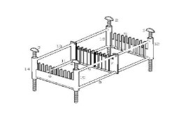 一种小型腐蚀箱覆铜板支架,它由第一覆铜板深度调节螺钉(1)、第二覆铜板深度调节螺钉(2)、第三覆铜板深度调节螺钉(3)、第四覆铜板深度调节螺钉(4)、第一覆铜板固定插槽(5)、第二覆铜板固定插槽(6)、覆铜板可移动插槽(7)、第一可移动插槽板滑动柱(8)、第二可移动插槽板滑动柱(9)、第三可移动插槽板滑动柱(10)、第四可移动插槽板滑动柱(11)、第一插槽柱(12)、第二插槽柱(13)、第三插槽柱(14)、第四插槽柱(15)组成,该支架可以防止覆铜板之间挤压摩擦,极大地提高了腐蚀后的印制电路板的质量,而且由于覆铜板之间的距离很小,每次腐蚀电路板的数量较多。